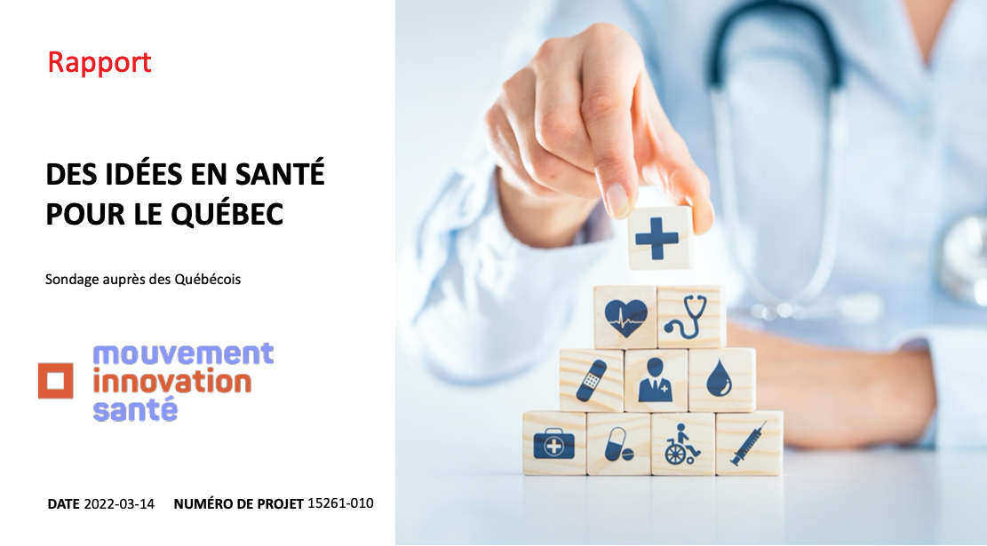 Dans le cadre du Mouvement Innovation Santé 2.0 (MIS 2.0), le Conseil des entreprises privées en santé et mieux-être (CEPSEM) et ses partenaires MIS 2.0 ont mandaté la firme Léger afin de mesurer l’opinion, l’évolution de l’opinion et la perception des Québécois à l’égard de divers éléments concernant le système de santé du Québec, plus particulièrement sur la place du privé en santé.