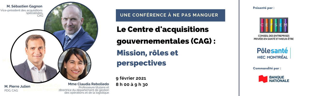 Sous la forme d’une présentation et d’une entrevue menée par madame Claudia Rebolledo, professeure titulaire et directrice du département de gestion des opérations et de la logistique à HEC Montréal, le séminaire permettra d’aborder le rôle du CAG et les perspectives en approvisionnement des organismes publics, plus spécifiquement en santé.