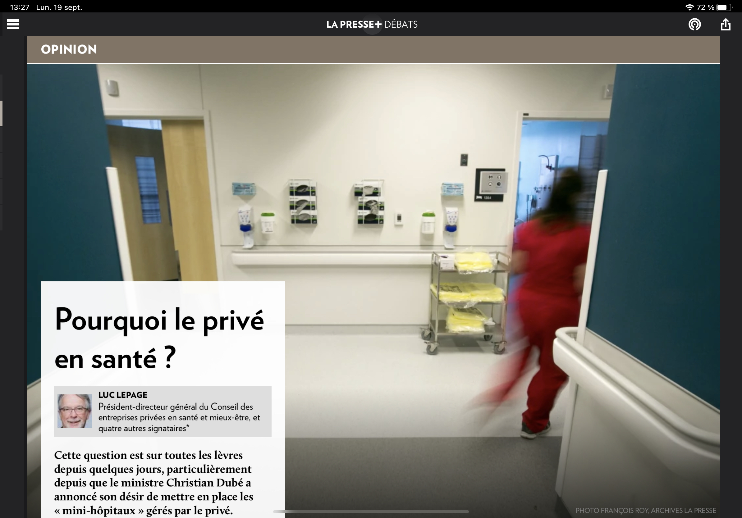Après un éditorial de Stéphanie Grammond dans LaPresse+ intitulé « Briser le tabou du privé en santé », une lettre ouverte intitulée « Pourquoi le privé en santé? » de la plume de Luc Lepage a été publiée.