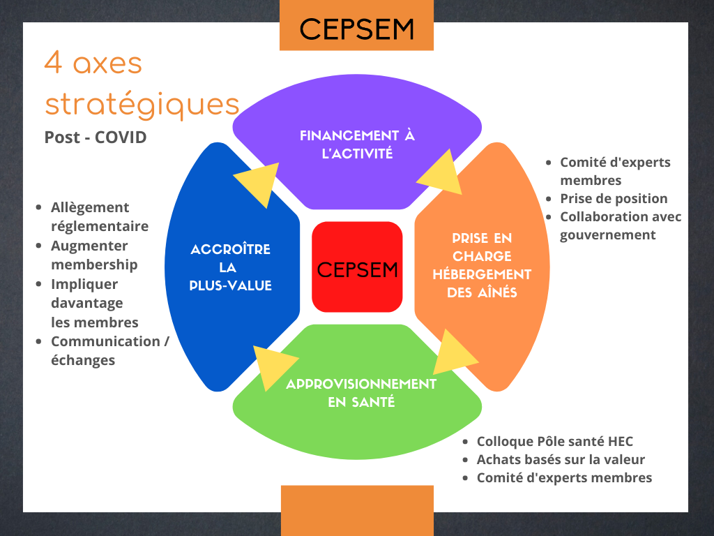 Grâce aux nombreuses consultations avec les comités d’experts en soins et hébergement aux aînés et en approvisionnement, nous avons fait plusieurs interventions auprès des cabinets des ministres pour positionner le CEPSEM comme acteur incontournable dans la mise en place de solutions pour la relance économique, ainsi que pour continuer de protéger nos aînés et nous avons rédigé plusieurs documents (lettres et mémoire) destinés aux ministres pour leur soumettre notre aide et notre collaboration.