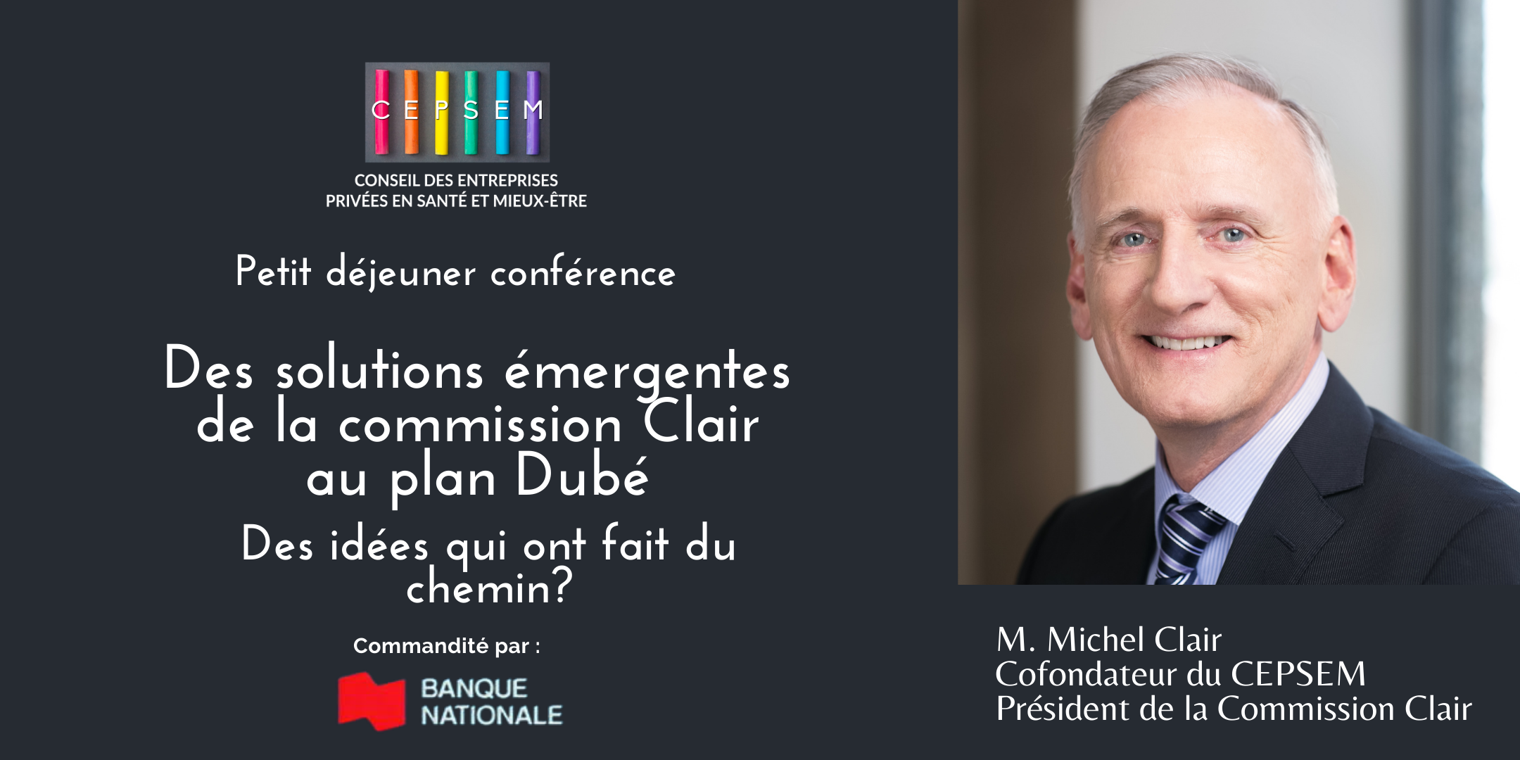 Le 26 avril dernier, nous avons accueilli plus de 30 personnes lors de notre premier petit déjeuner conférence au Centre Sheraton Montréal. Michel Clair nous a raconté les solutions émergentes proposées dans son rapport qui ont été reprises dans le plan Dubé présenté ci-haut et quelques anecdotes des autres qui ont malheureusement été ignorées….