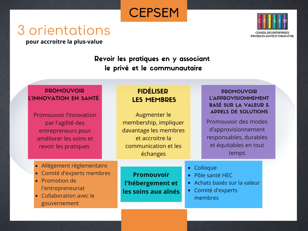Le CEPSEM continuera ses efforts de collaboration et de présence auprès des instances gouvernementales afin de participer aux consultations pour assurer une pluralité des services dans notre réseau public de santé.