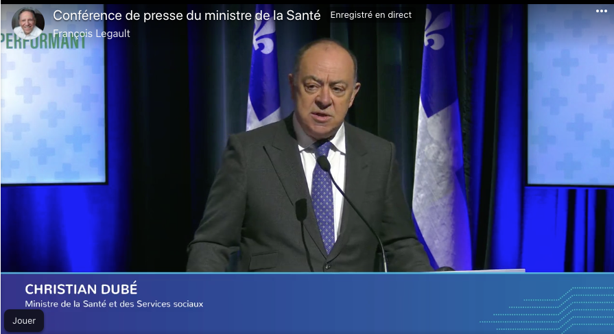 Mardi le 29 mars 2022, en direct du CHUM, le ministre de la santé et des services sociaux, M. Christian Dubé, accompagné du ministre délégué à la santé, M. Lionel Carmant, a tenu une conférence de presse annonçant l’organisation des soins de santé et des services sociaux au Québec, à laquelle Luc Lepage a été convié.