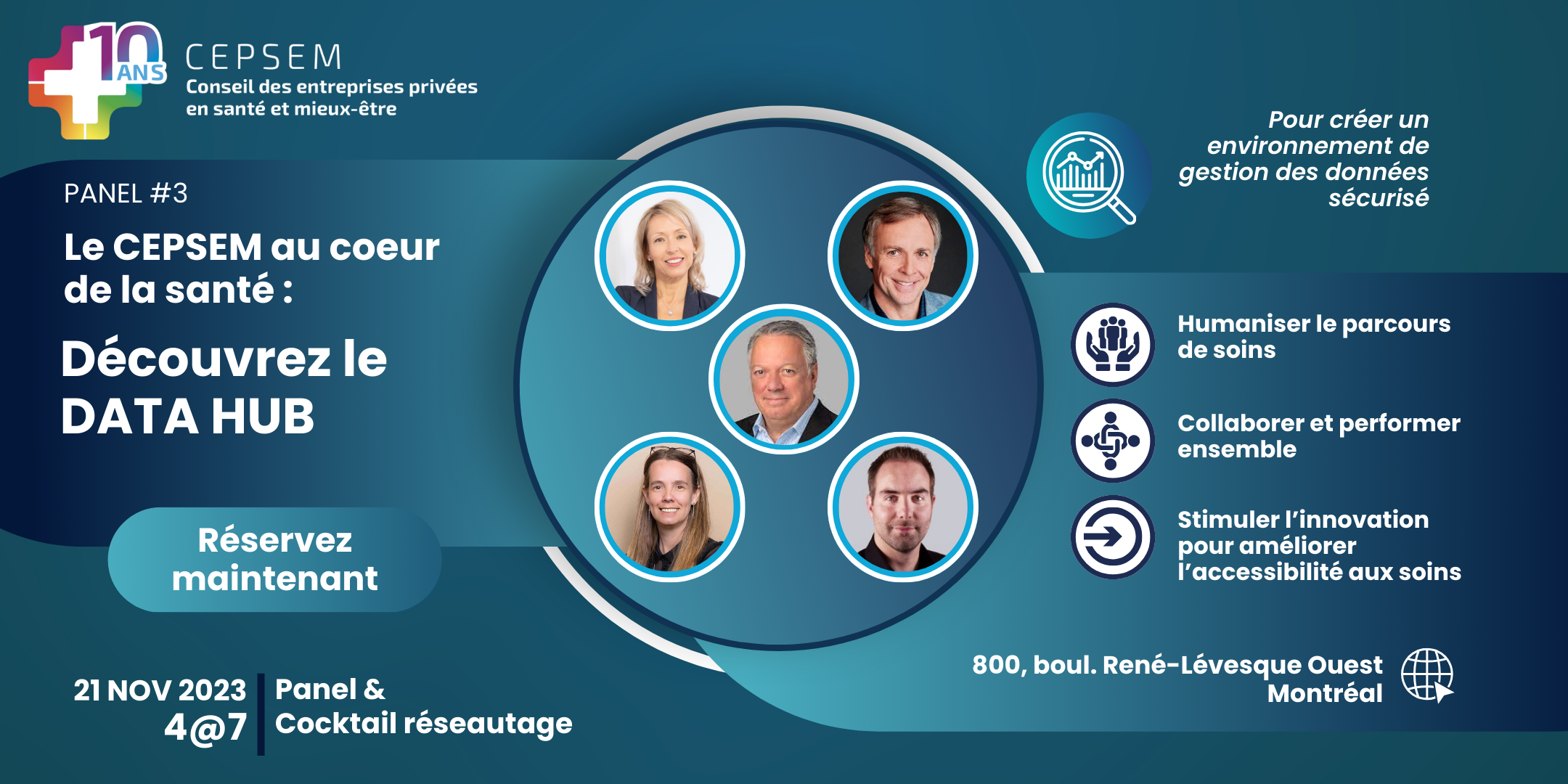 D’une durée de 90 minutes, ce débat portera sur la gestion des données en santé. De par l’orientation que le CEPSEM a prise en planifiant la création d’un Hub d’innovation en santé basé sur la valorisation des données (BI), nous souhaitons faire intervenir des panélistes sur cet enjeu. Nous présenterons également nos travaux sur cette initiative qui vise à mettre en place un processus de partage des données pour assurer une efficacité au niveau des soins offerts aux Québécois.